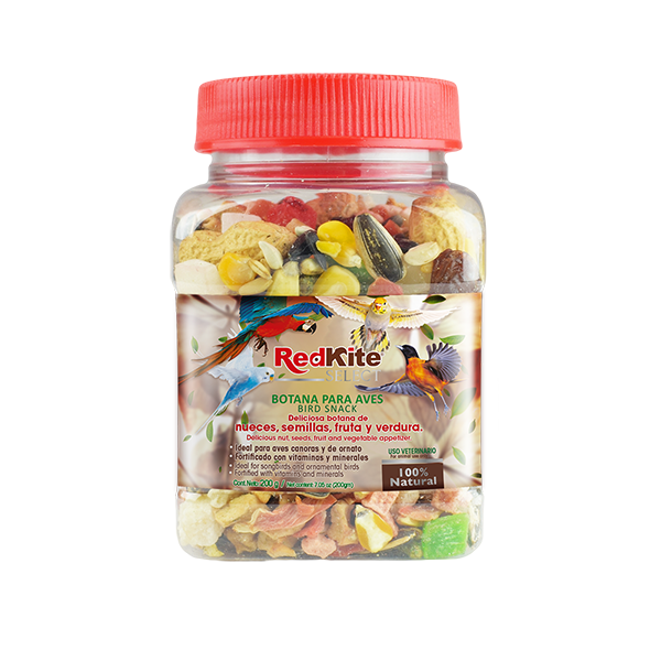 La mezcla de semillas, fruta y verdura de Redkite, es un complemento adecuado para la alimentación de las aves de ornato, disfrutarán de un producto natural que además de gustarles, les ofrece nutrientes muy beneficiosos para ellas. Además de estar adicionado con pellets fortificados con vitaminas y minerales.